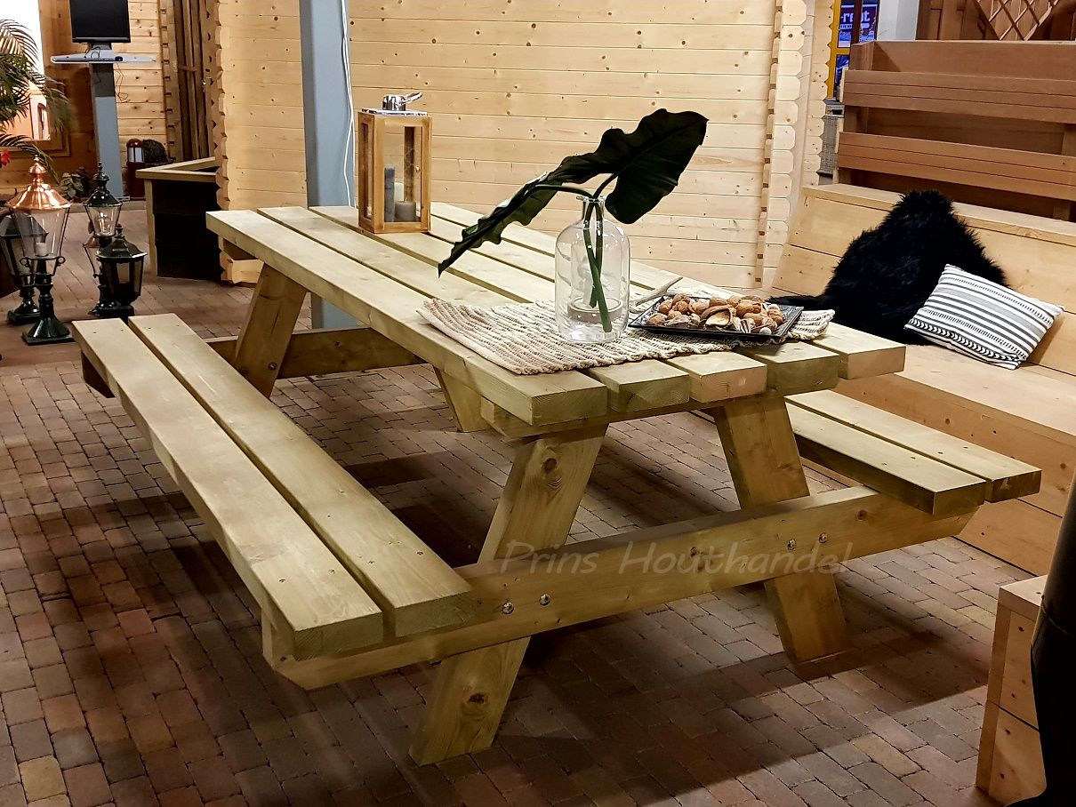 Kunt u de juiste maat picknicktafel niet vinden, net te kort, net te lang, net te smal of net te breed, niet hoog genoeg of juist te hoog, geen paniek. Hier bij Prins Houthandel kunt u deze op maat laten maken. De picknicktafel geimpregneerd maatwerk (extra zwaar) word voor u op maat gemaakt met geimpregneerd vuren baddinghout (58x155cm). Wilt u met 4 tot 18 personen aan een tafel zitten en genieten van en met elkaar ? dat kan met deze op maat gemaakte, extra zware picknicktafels.