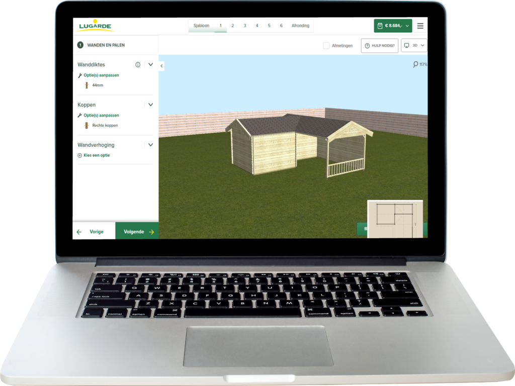 Met de Lugarde configurator kunt u uw eigen Tuinhuis of overkapping ontwerpen. U kunt zelf uw ramen en deuren uitkiezen, de afmetingen bepalen, de Binnen- en/of buitenvloeren toevoegen en kiezen of u het buitenverblijf wilt laten impregneren.